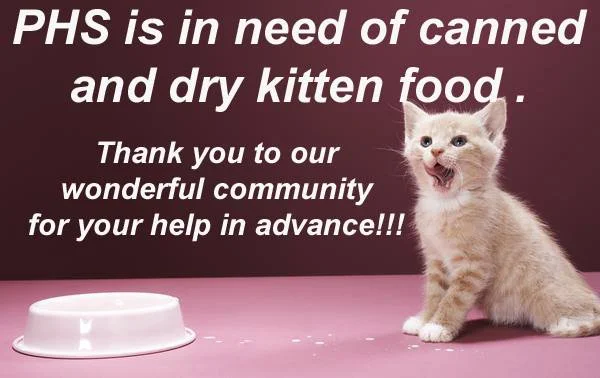 /The Peterborough Humane Society are in urgent need of wet and dry kitten food for their 30+ kittens, according to a posting on their Facebook page. The food can be dropped off at PHS, which is located at 385 Lansdowne St. E. in Peterborough, Monday to Saturday 8:00 a.m. to 4:30 p.m.