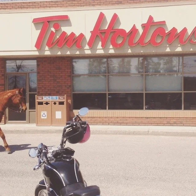 BY HORSE, LIKE THIS ONE AT THE TIM HORTONS ON WATER STREET NEAR TRENT...