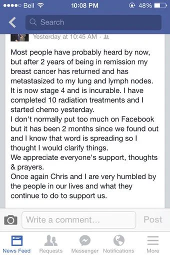 A Facebook post from Anita on her condition...