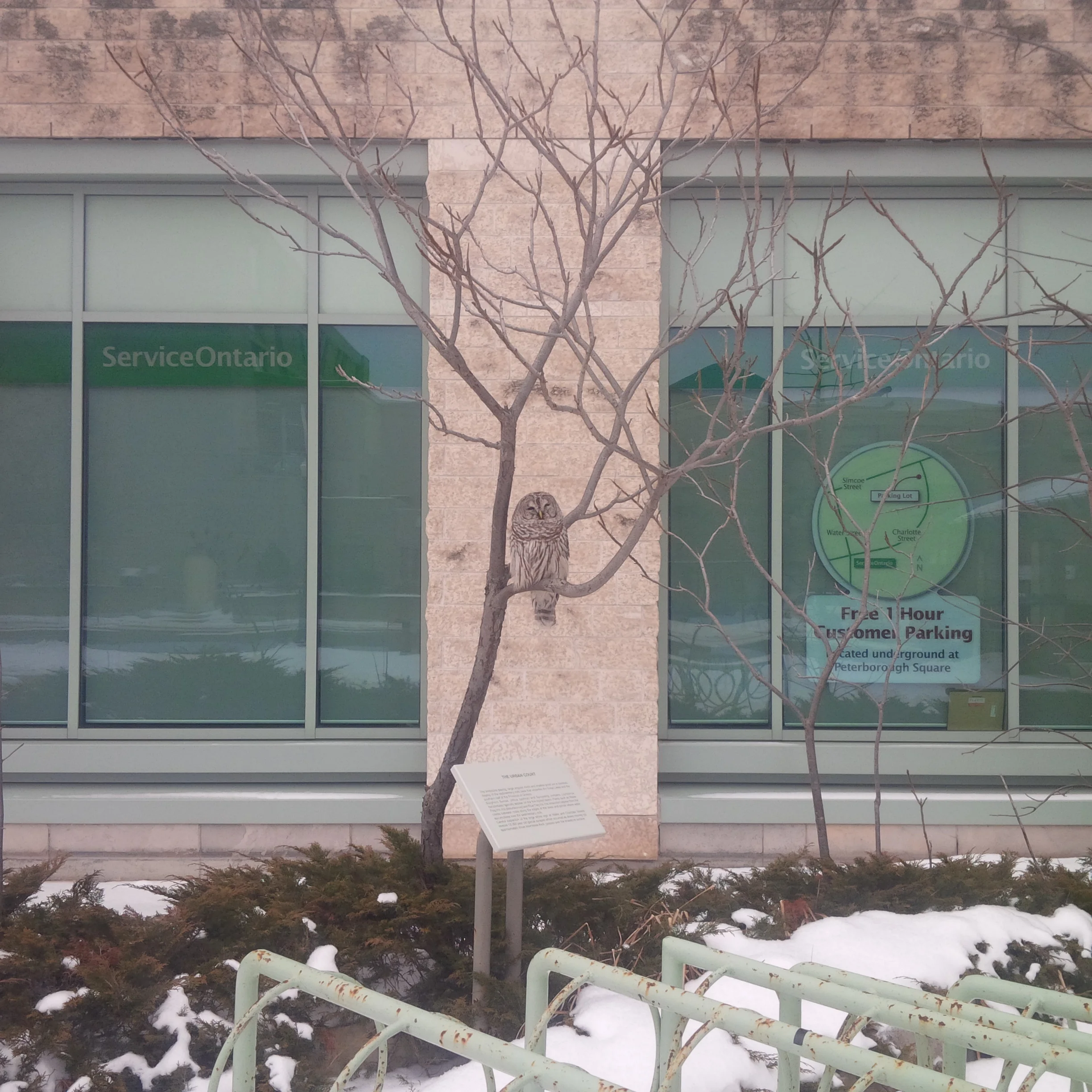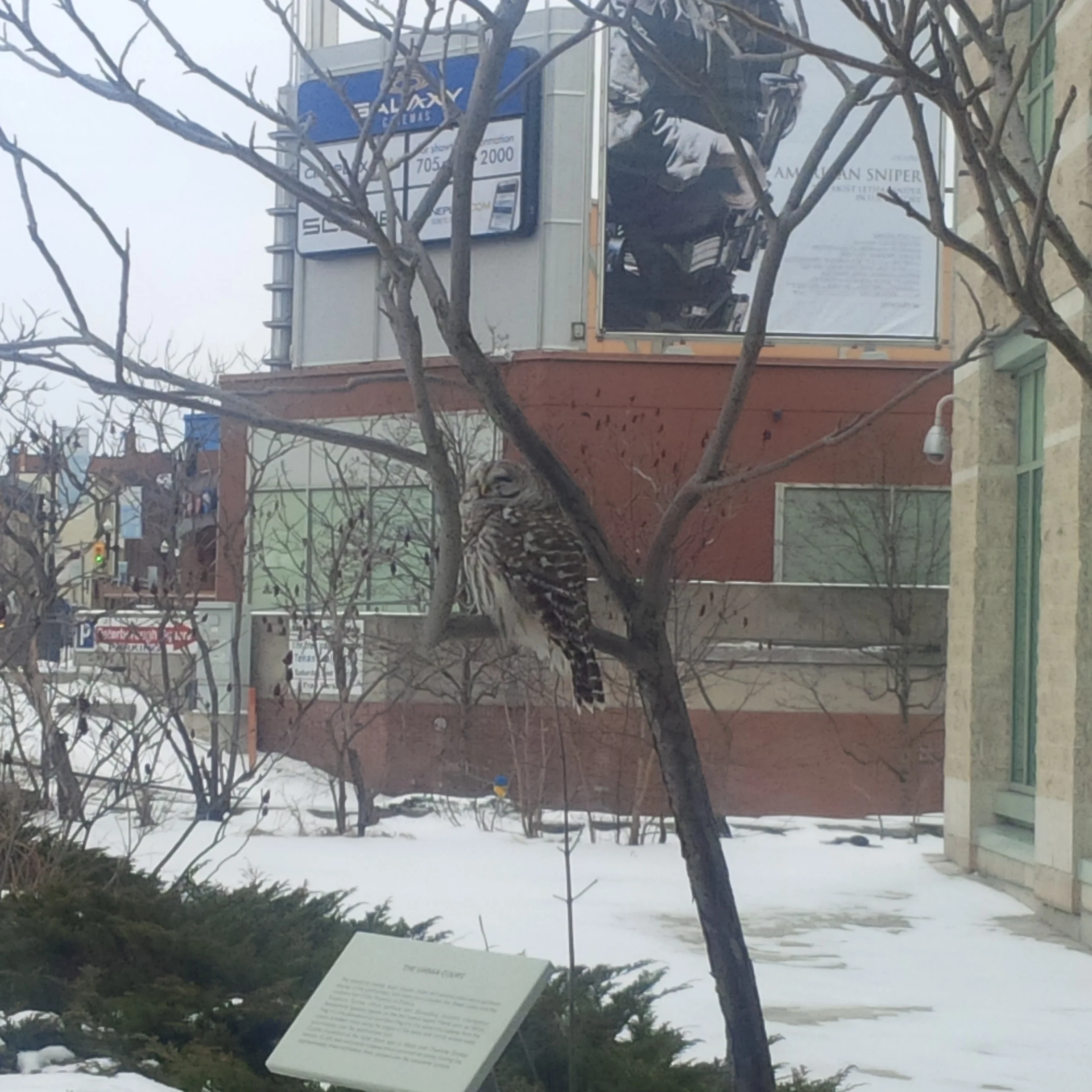 /An owl has parked itself here on a Saturday in the city. The owl does not need a free hour of underground parking at Peterborough Square, because it has this tree. Great use of natural resources. Creative ingenuity.