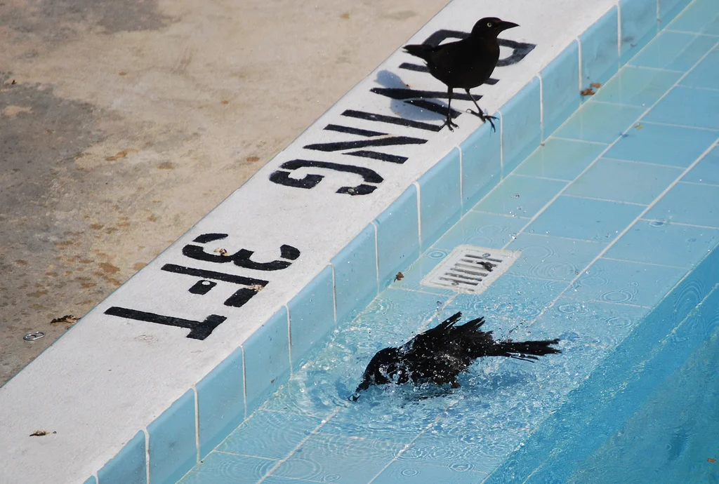 8. Don’t drink the pool water kids! Grackles and other songbirds clean their nests by removing sacs of waste generated by their babies and drop them in local water locations including swimming pools.