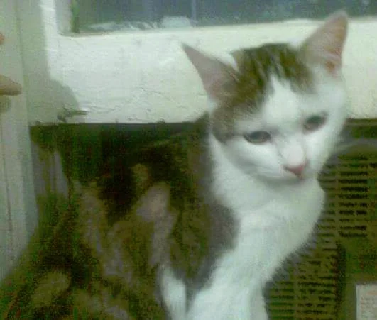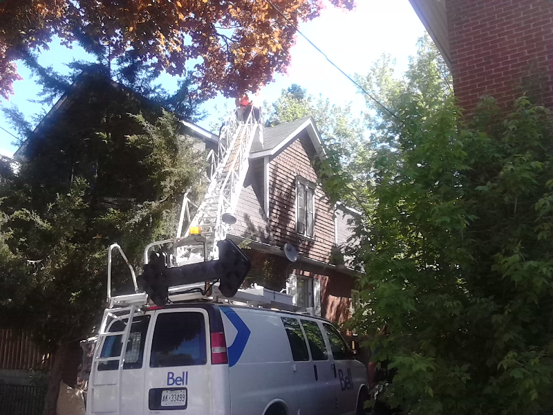 "Holly is my wife's cat. I got Holly for my wife in the Christmas of 2012 (thus the name). She has been an indoor cat since, and is extremely patient with our young children. Monday night, my stepson Dylan came home from a friend's and saw her outside. He tried to get her to come in, but she ran away. We watched for her and watched for her, but didn't see her. The next day, our neighbours asked us if our cat was missing, and proceeded to tell us she was on the roof of the house on the other side of them, and that they had heard 'a ruckus' the night before that sounded like a raccoon. The house has been unoccupied for a couple weeks, and is a 3-storey house. At that time, we figured she would come down on her own, and gave her a day to do so. Last night (Wednesday), after my wife worrying about Holly for three days—and the neighbours just not being able to take watching her up there any more—we decided to try to get her down. The whole neighbourhood got involved, people climbing up ladders and dragging their own ladders over. The Fire Department came out, their ladder wouldn't reach high enough, and were concerned due to trees and wires in the area. We just could NOT get her down. This morning, the neighbour on the other side of us, Chris Villeneuve, decided he was going to climb the tree that actually touches the roof she was on. Before getting to that, a Bell truck went by and Chris flagged them down. These Bell guys were nice enough to bring their 'bucket truck' over and lift up to the roof, where Holly came over, let them pick her up, and got down off the roof."