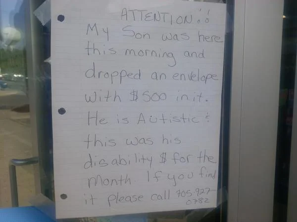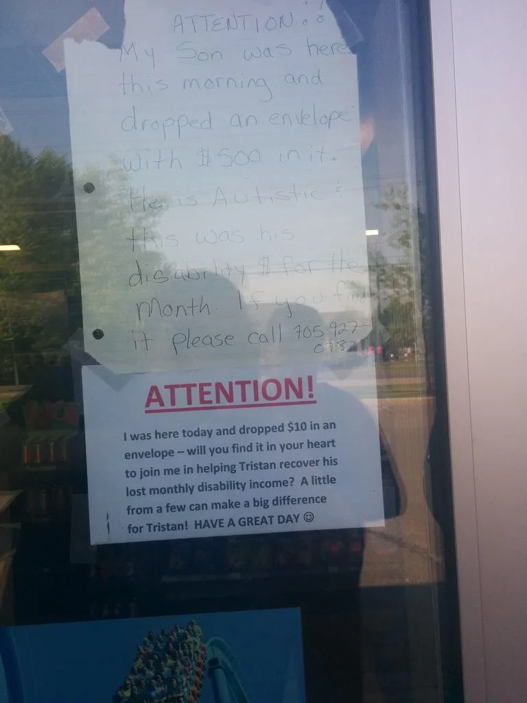 Tristan Brake, a 19-year-old young man with autism, dropped an envelope this morning (May 29th) containing $500 in it at the Mac's store at Sherbrooke and Denure...