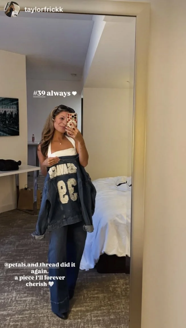 Frick posting an Instagram story of her with the custom jacket and thanking Petals & Thread. Screenshot.