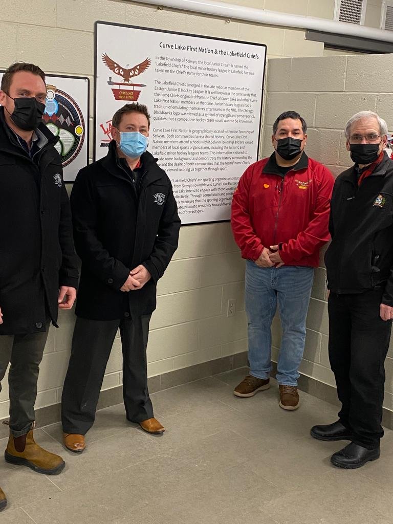 (from left to right) George Ripoll, Chiefs assistant general manager; Shawn Dunbar, Chiefs general manager; Jeff Jacobs, Deputy Chief of Curve Lake First Nation and Andy Mitchell, Selwyn mayor. Photo courtesy of the Lakefield Chiefs.