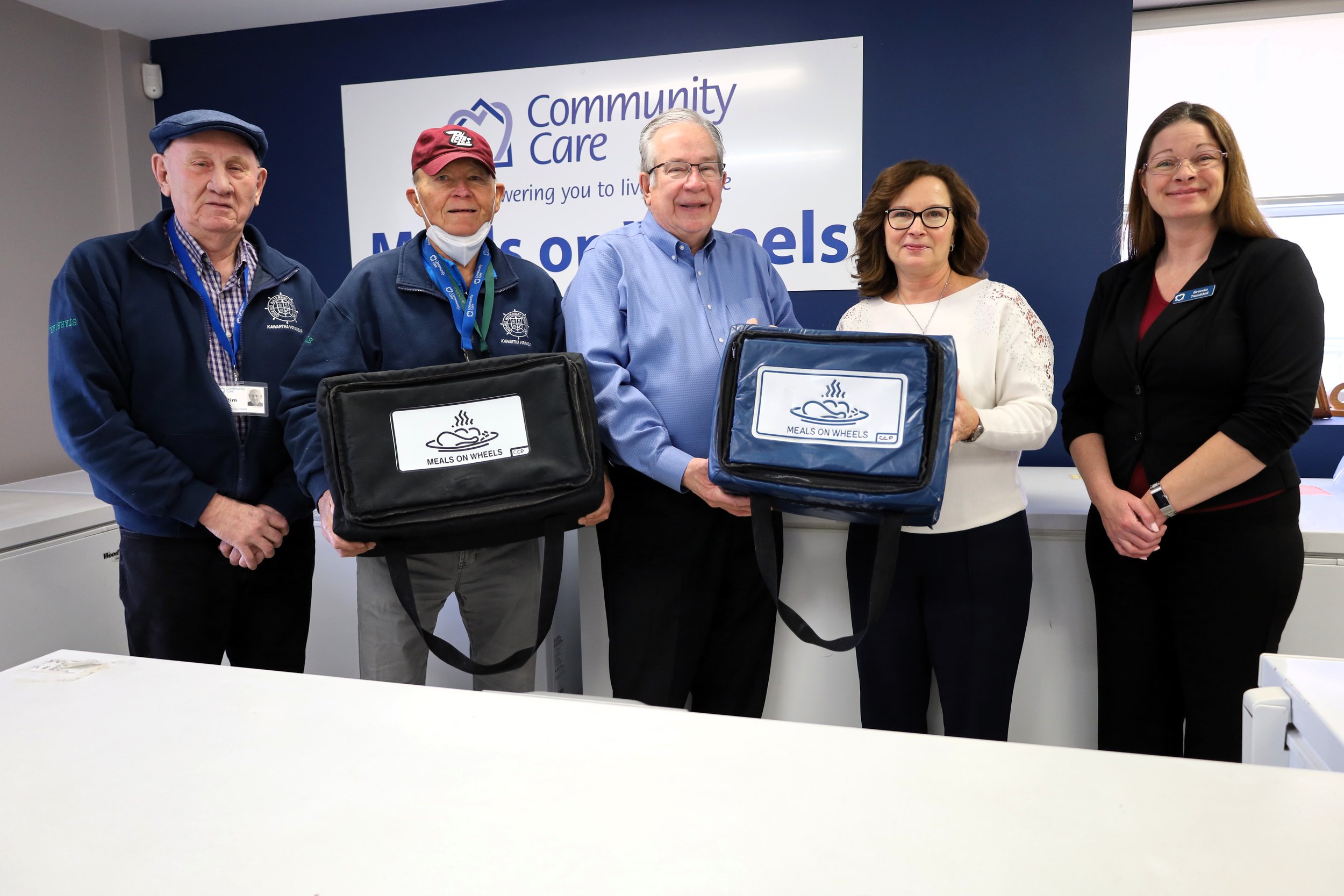 (From left to right) Meals on Wheels Volunteers Jim and Bob; Mayor Jeff Leal; Danielle Belair, CCP CEO and Brenda Twaddell, CCP coordinator of Meals on Wheels and grocery services. Community Care Peterborough also offers a Meals on Wheels subsidy program for clients in need of financial assistance. Photo by David Tuan Bui.