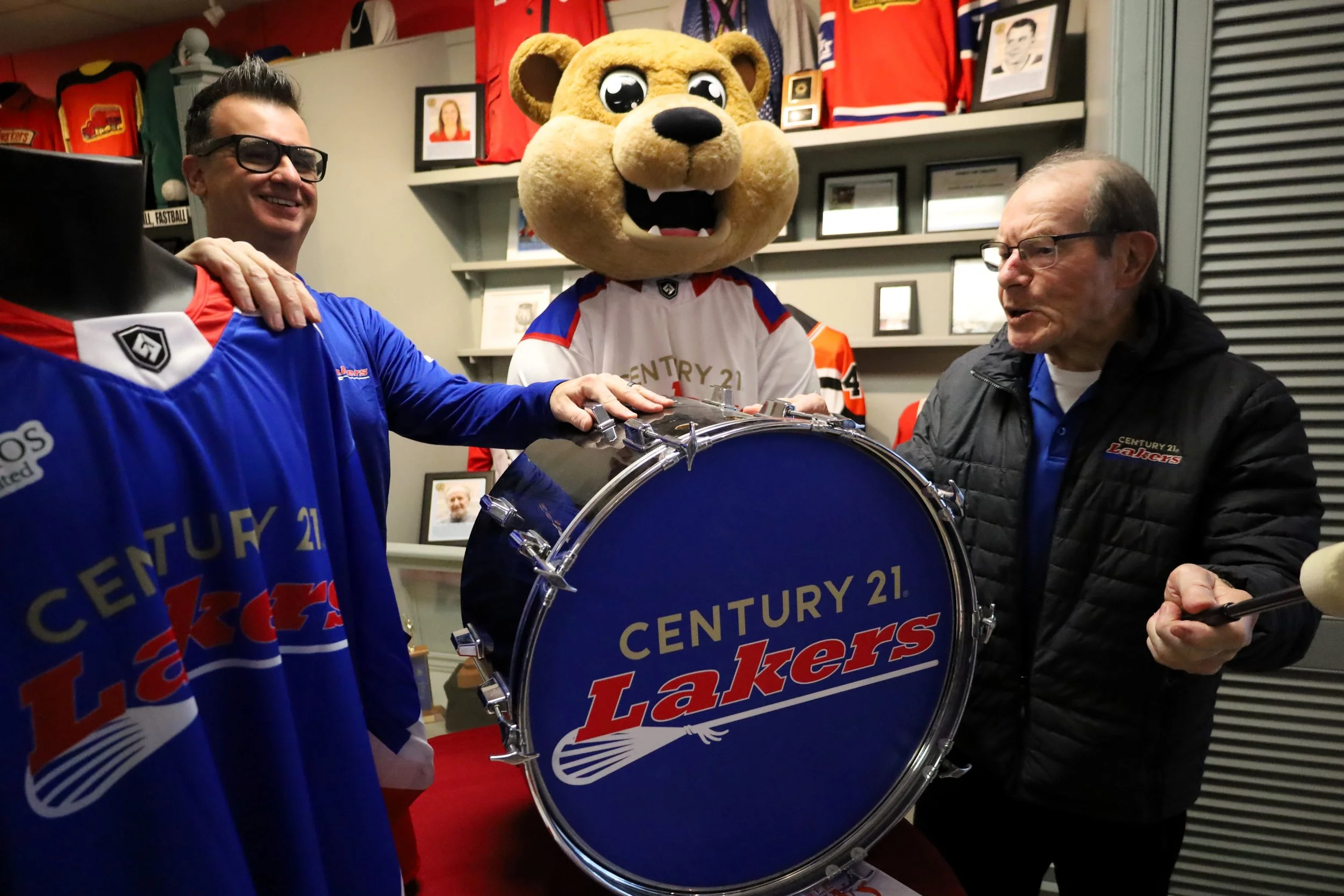 (from left to right) Pete Dalliday, Lakers director of community engagement; Teddy, Lakers mascot and Ted Higgins, Lakers Board of Directors president banging the drum for a “Go, Lakers, Go!” chant. Photo by David Tuan Bui.
