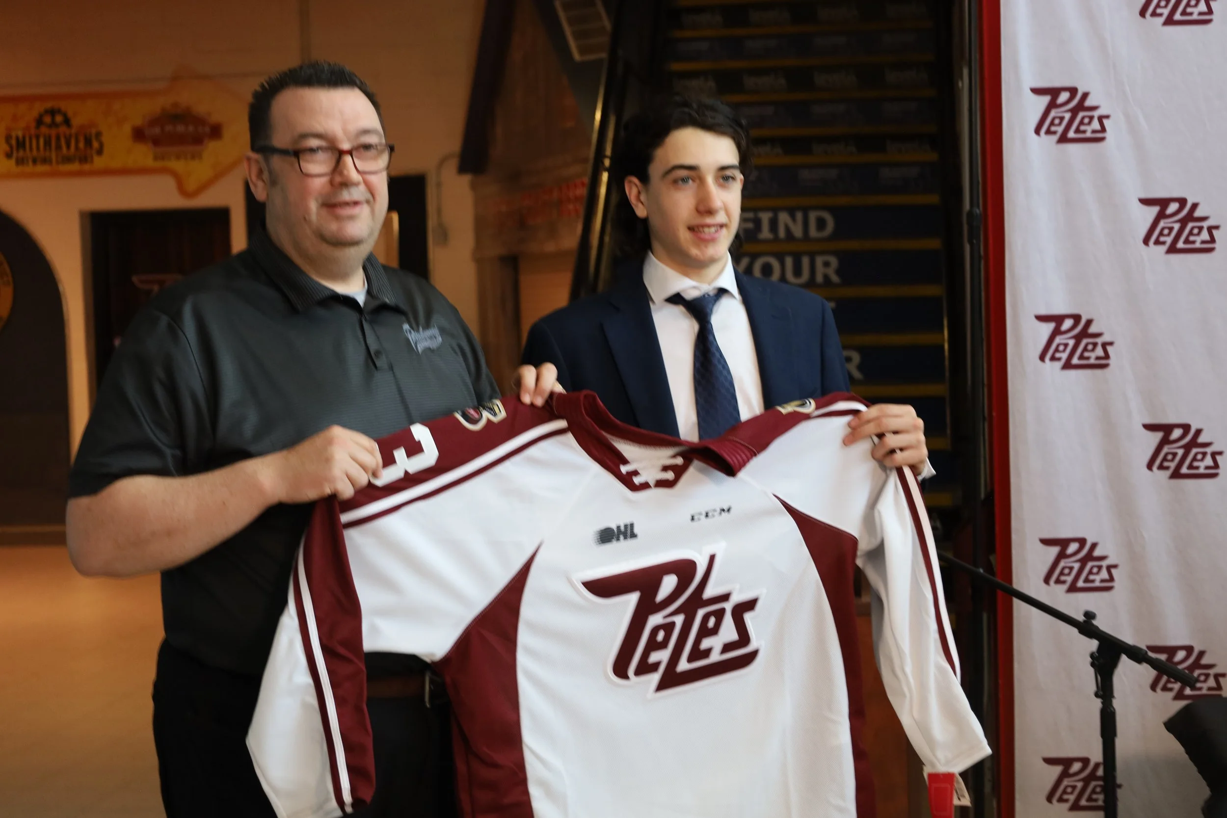 Michael Oke, Petes general manager (left) with Joseph Cadorin (left) was drafted 76th overall from the U16 AAA Ajax-Pickering Raiders. The team introduced Cadorian to the public at the Peterborough Memorial Centre on April 22. Photo by David Tuan Bui.