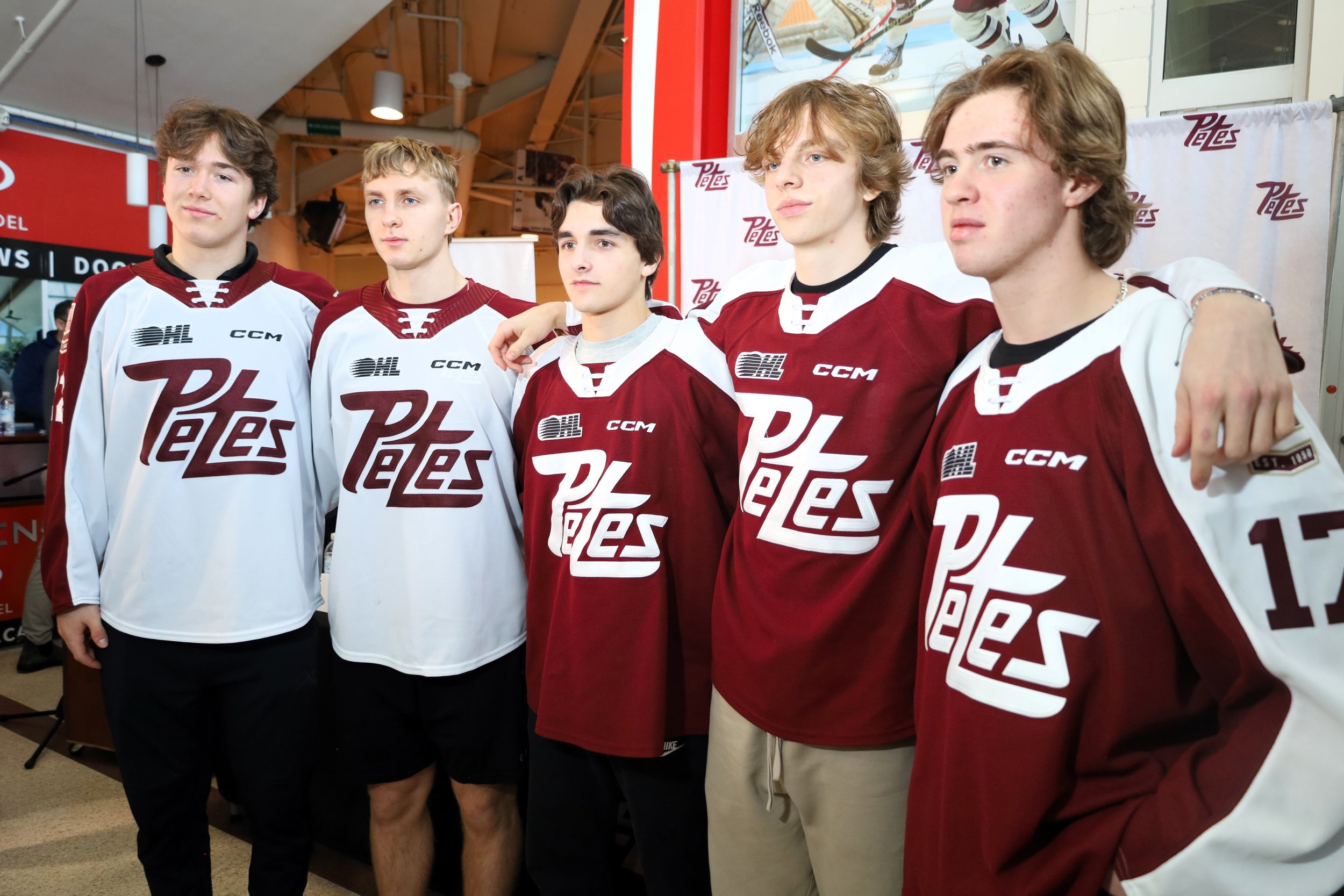 (From left to right) Nico Addy, Martin Matejicek, Aiden Young, Caden Taylor and William Haley as the team’s newest Peterborough Petes. Grayden Strohack was absent due to an illness. Photo by David Tuan Bui.