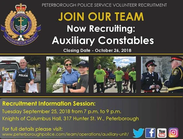 The Peterborough Police Service is hosting an Auxiliary Recruitment Information Session on Tuesday September 25th from 7 p.m. to 9 p.m. at the Knights of Columbus Hall (317 Hunter Street West). The closing date for applications is October 26, 2018. Learn more here.