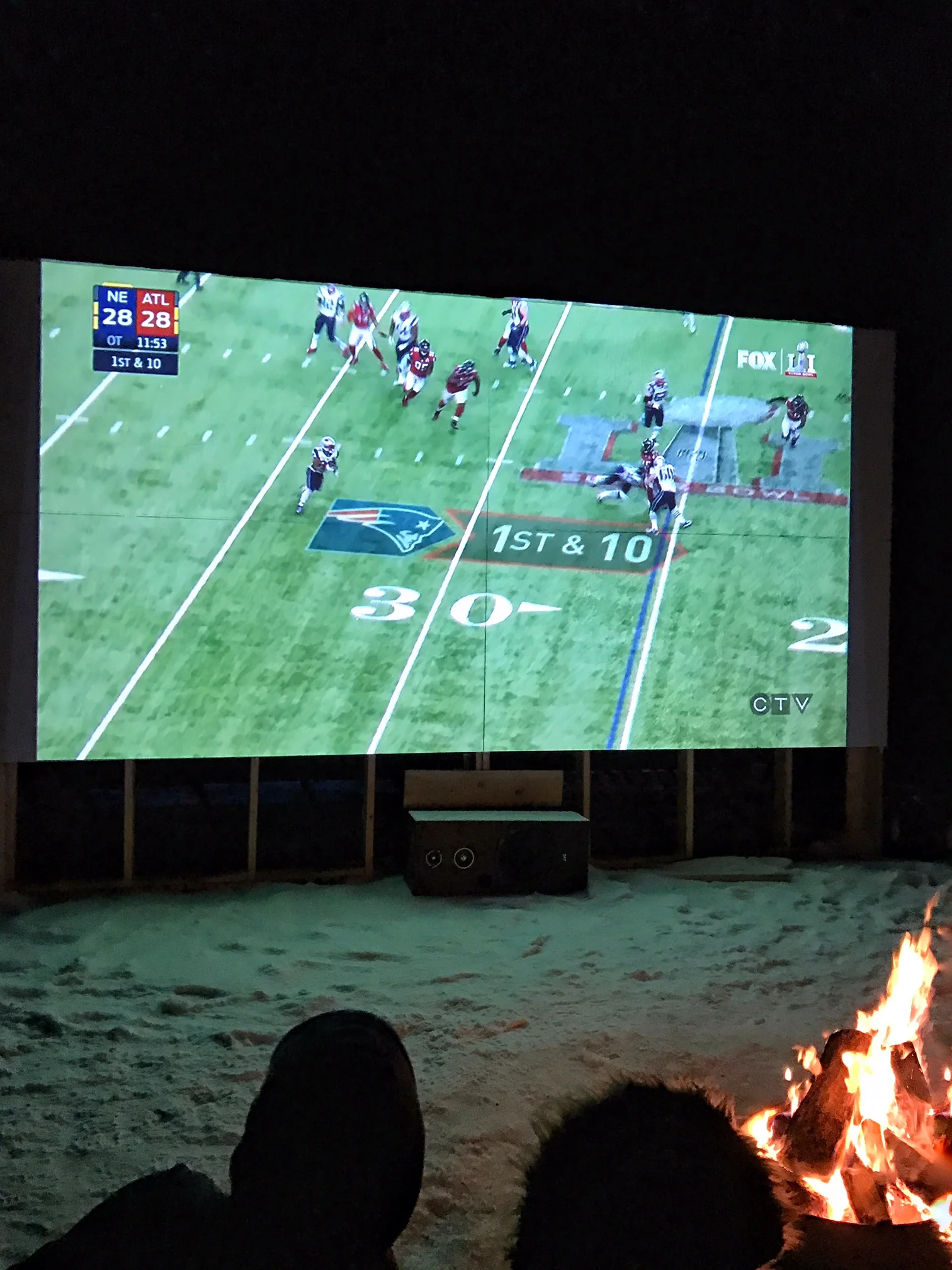 About 50 people watched an epic Super Bowl game in an epic way, taking in New England's comeback win over Atlanta in front of a 16-foot outdoor screen on a beauty night on Chemong Lake near Peterborough.