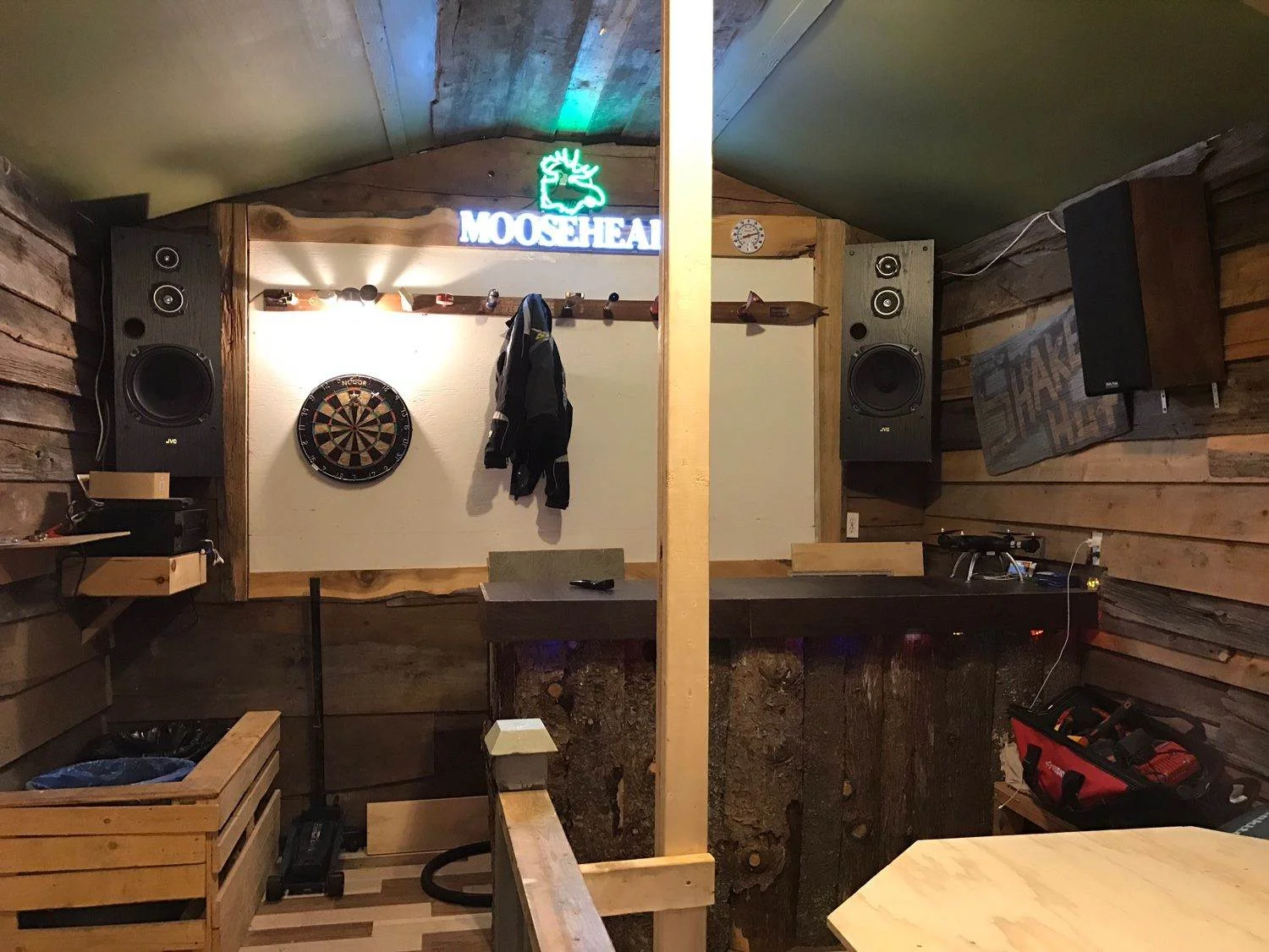 We took you inside the Ultimate Man Cave on ice last week, and here's a more domesticated neighbouring ice hut on Chemong Lake. It's owned by Jamie Mills, and this 12 x 12 ice hut "is built with the finest comforts of home," he says. It comes complete with a 6 x 12 deck that holds the smoker (gotta love smoked ribs), a wood stove, 42" HDTV TV set, satellite dish, deep fryer, dart board, hardwood floors, cedar ceiling and pot lights. It's finished inside and out with vertical vinyl siding. The bench seats are finished with 4" thick leather, and there is even 5 fishing holes. The fireplace is also finished off nice with culture stone. Here's a few pics inside...