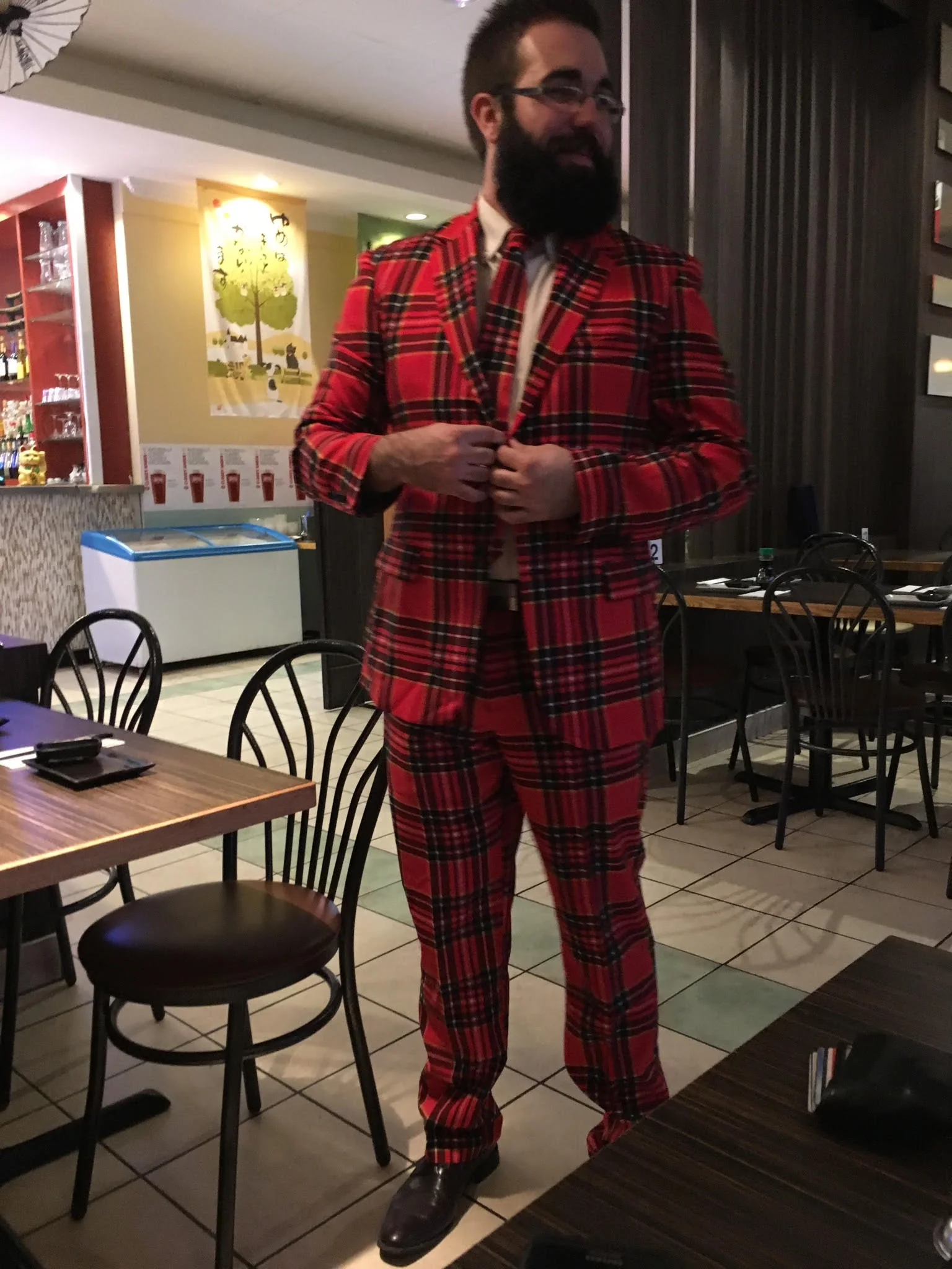 /A Trent University student and aspiring entrepreneur named Matthew Thompson is standing out at events not only because of his engaging personality but because of his epic plaid suit and beard.