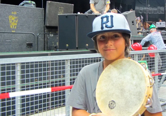 Ed's son Aidan with the tambourine Eddie Vedder gave him at Berlin concert