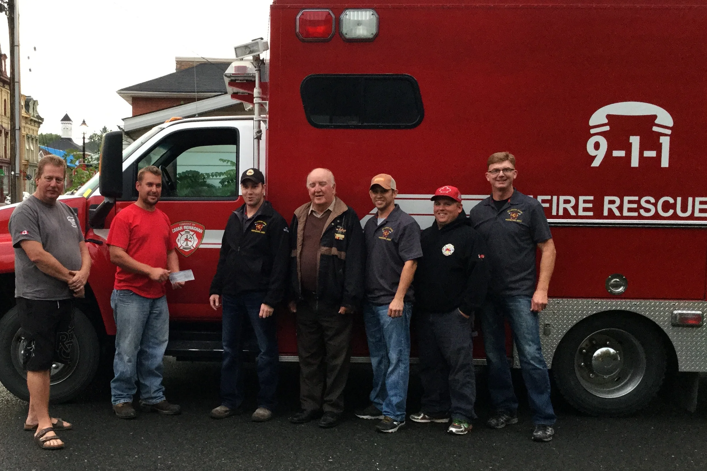 Cheque presentation of $1320 to the Millbrook Cavan Firefighters Association. Left to right: Firefighter Keith Shultz; Mike Telford, Cattlemen's BBQ Fundraising Chair; Adam Goyne, President of the Millbrook Cavan Firefighters Association; Larry Jinkerson, Peterborough County Cattlemen President; Steve Branscombe, Millbrook Cavan Firefighters Association Treasurer; Firefighter Matt Woodward, Firefighter Doug Wilson.