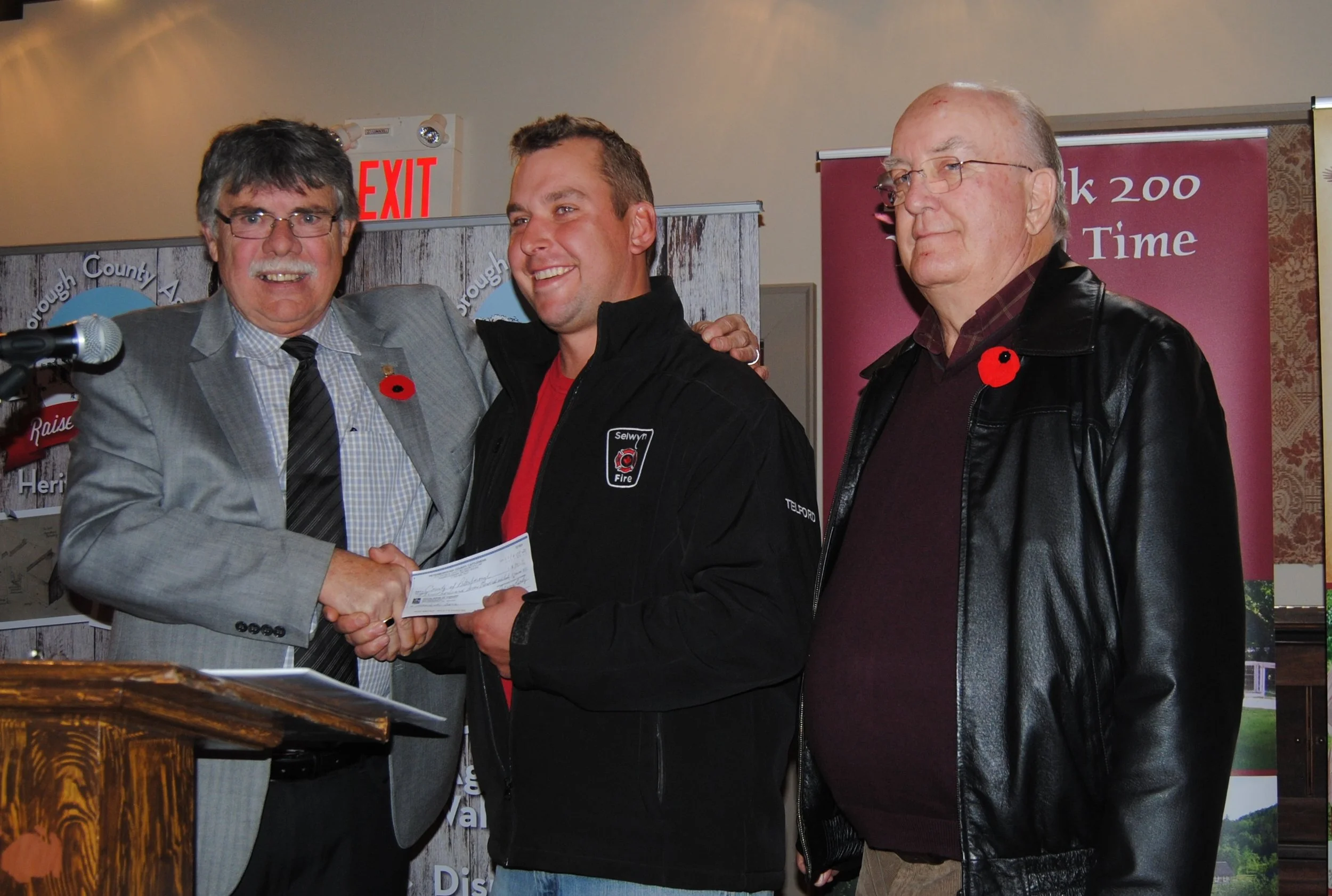 Cheque presentation of $3760 for the Peterborough County Agricultural Raising the Barn: Heritage Building. Left to right: Peterborough County Warden, J. Murray Jones; Mike Telford, Cattlemen's BBQ Fundraising Chair; and Larry Jinkerson, Peterborough County Cattlemen President