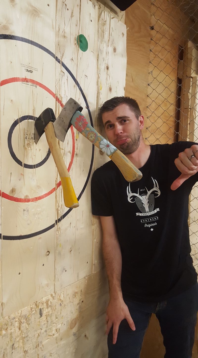 One of the best shots ever made at Peterborough Axe Club happened at the Thursday league night when Ken and Amy Smith hit this Robin Hood—and the Bull's Eye at the same time—while practising doubles.
