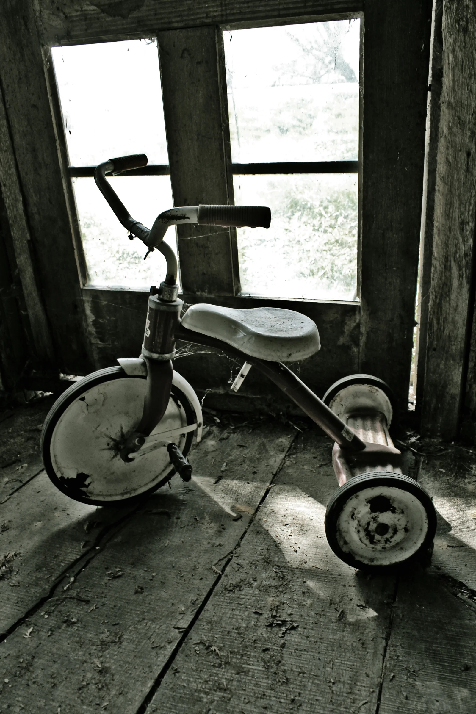(Photograph was taken in an abandoned house near Campbellford. Many vintage children's toys were found in this home, including dolls, board games and this lonely little trike.)