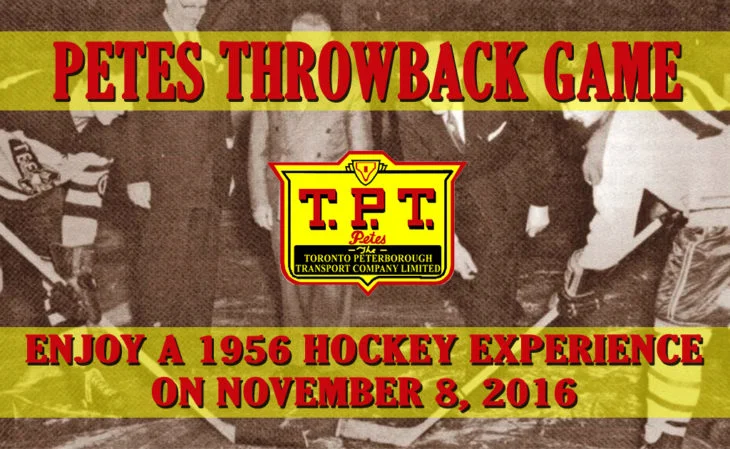 /On Tuesday, November 8th—exactly 60 years to the day of the first ever OHA game at the Peterborough Memorial Centre—the Peterborough Petes will recreate the 1956 hockey game night experience, wearing replica 1956 T.P.T Petes uniforms. They will be playing against the Niagara IceDogs, who will be wearing St. Catharines Teepees throwback jerseys.