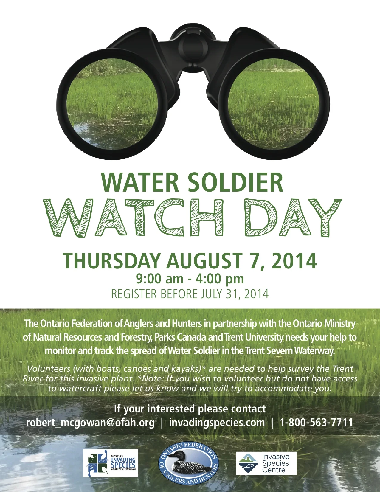 It is the OFAH's goal to stop the spread of this plant to other locations. Throughout this summer, OFAH and MNRF staff are on the water monitoring and mapping the water soldier colonies, thanks to a $35,000-grant from the Invasive Species Centre, and supported by a Water Soldier Management Plan. OFAH is putting out a call to volunteers to join them August 7th for Water Soldier Watch Day and help them track and monitor this highly invasive plant. More deets in the poster below...