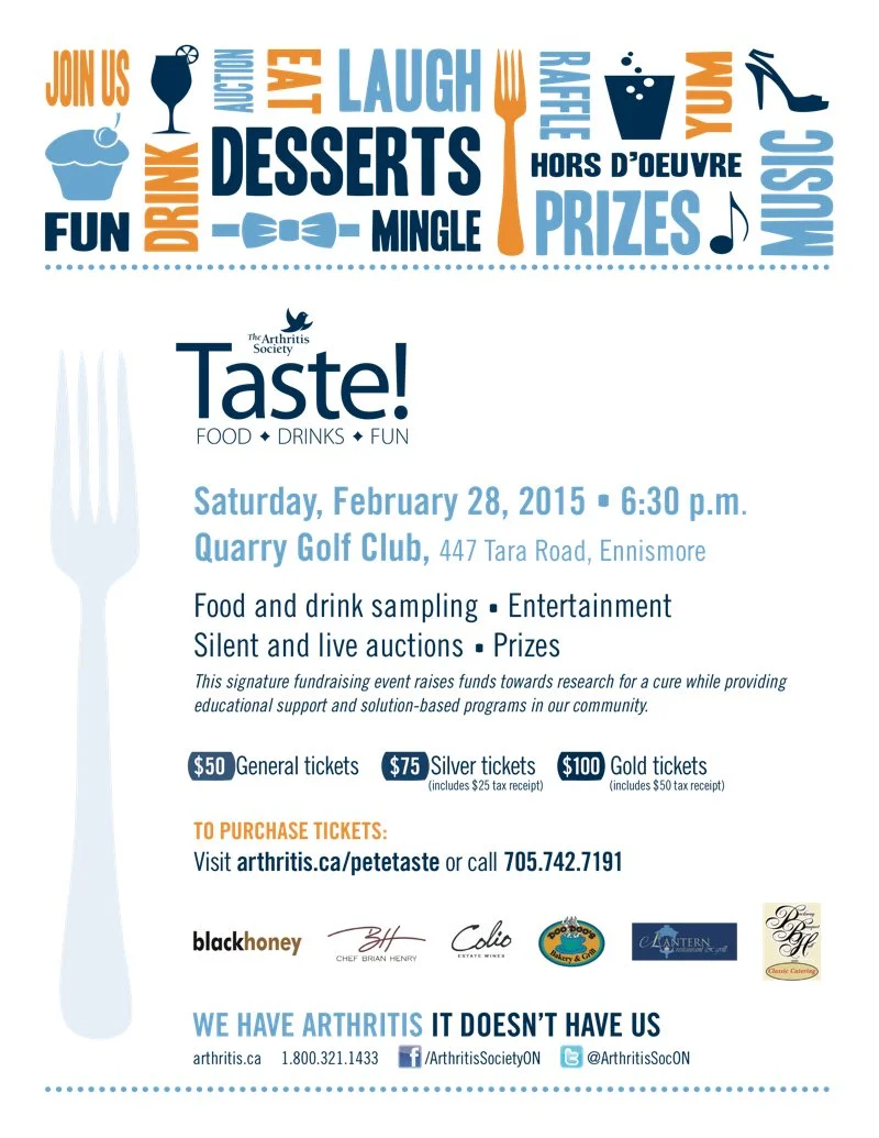 The Arthritis Society presents Taste! A fundraiser with Food and drink sampling, Entertainment, Silent and live auctions and Prizes.