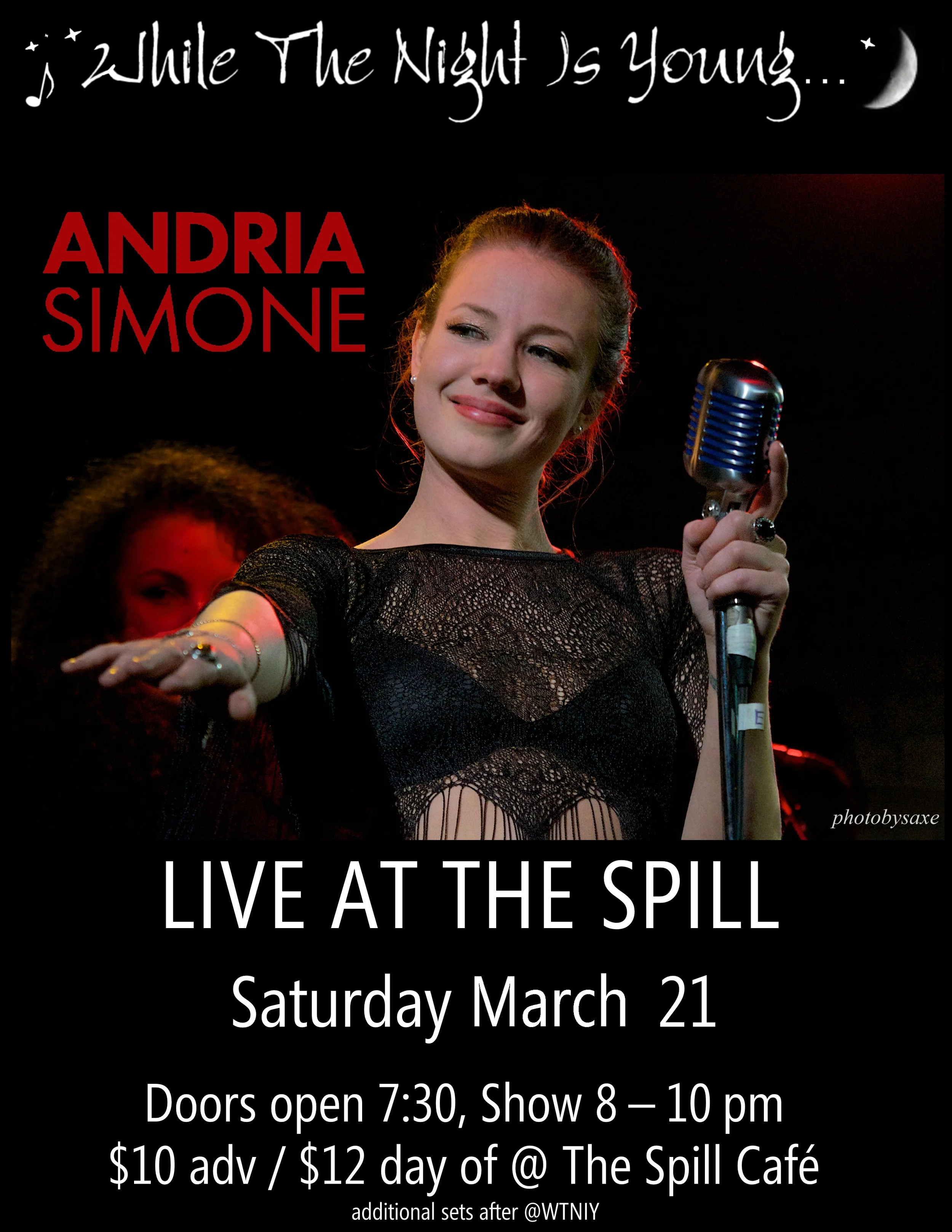 While the Night is Young is showcasing Andria Simone at her first Peterborough performance. In this age of genre mash-ups her sound might best be described as funkadelic blues. Andria’s torch-singer-meets-bluesy grit voice carries both original and cover tunes with equal authority. Her sound is framed and enriched by band members, George Nikolov, Mark Wilson, Brian Dhari, Dave Kirbyrich on guitar, drums, bass and sax.