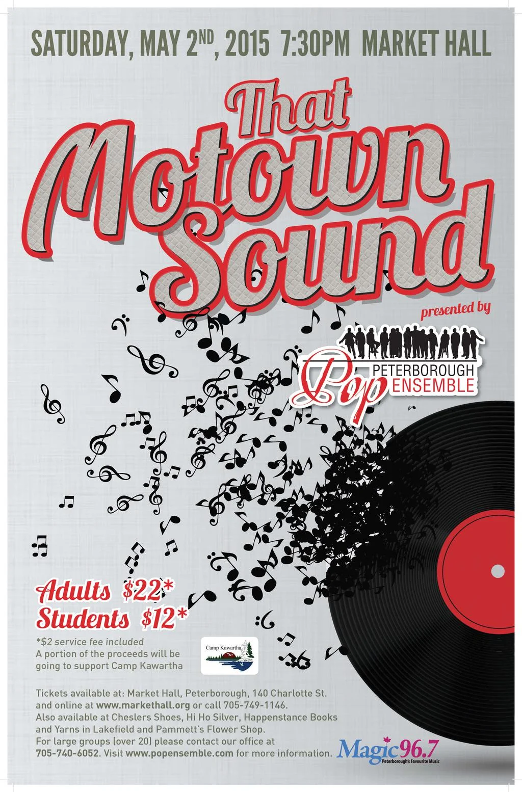 Detroit. 1960. The Motown Record Corporation is founded by Berry Gordy Jr. and a new style of soul music, with a distinct pop influence, is born. The Peterborough Pop Ensemble, under the direction of Barbara Monahan, is thrilled to present That Motown Sound on Saturday, May 2, 2015, 7:30 p.m. at Market Hall Performing Arts Centre in Peterborough. Come celebrate the music and artists that changed history – artists such as Marvin Gaye, Diana Ross and The Supremes, Stevie Wonder, Gladys Knight, The Four Tops, The Jackson 5 and many others.