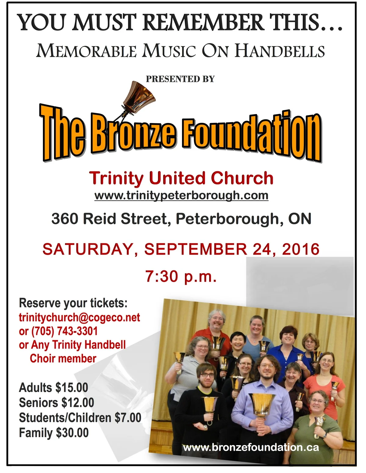 This concert is a fundraiser for the Bells of Trinity hand bell choir. Ticket prices are Adults- $15; Seniors- $12; Children/Students- $7; and Families $30. Tickets may be purchased through the Trinity church office at 360 Reid Street (705) 743-3301 or online at www.trinitypeterborough.com. Parking is available both at the church and the adjacent municipal lot.