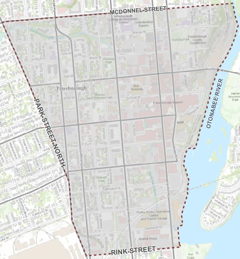 As shown on the map, the study area is bound by McDonnel Street to the north, Park Street to the west, Rink Street to the south, and the Otonabee River to the east.