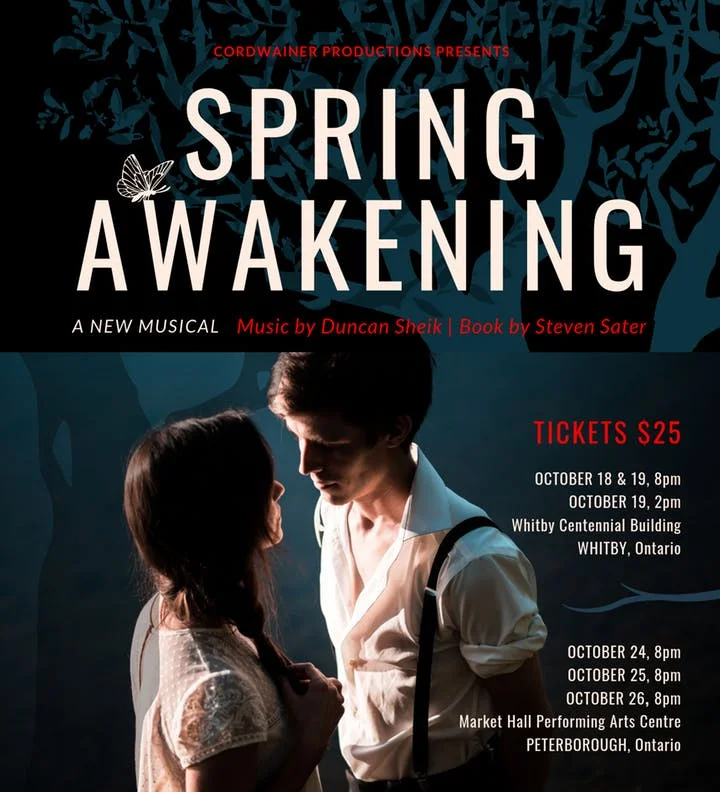 Cordwainer Productions is excited to present its fifth full-length production, and fourth full-length musical Spring Awakening, playing October 18 and 19 at the Courthouse Theatre in Whitby, and October 24, 25 and 26 at Market Hall Performing Arts Centre in Peterborough.